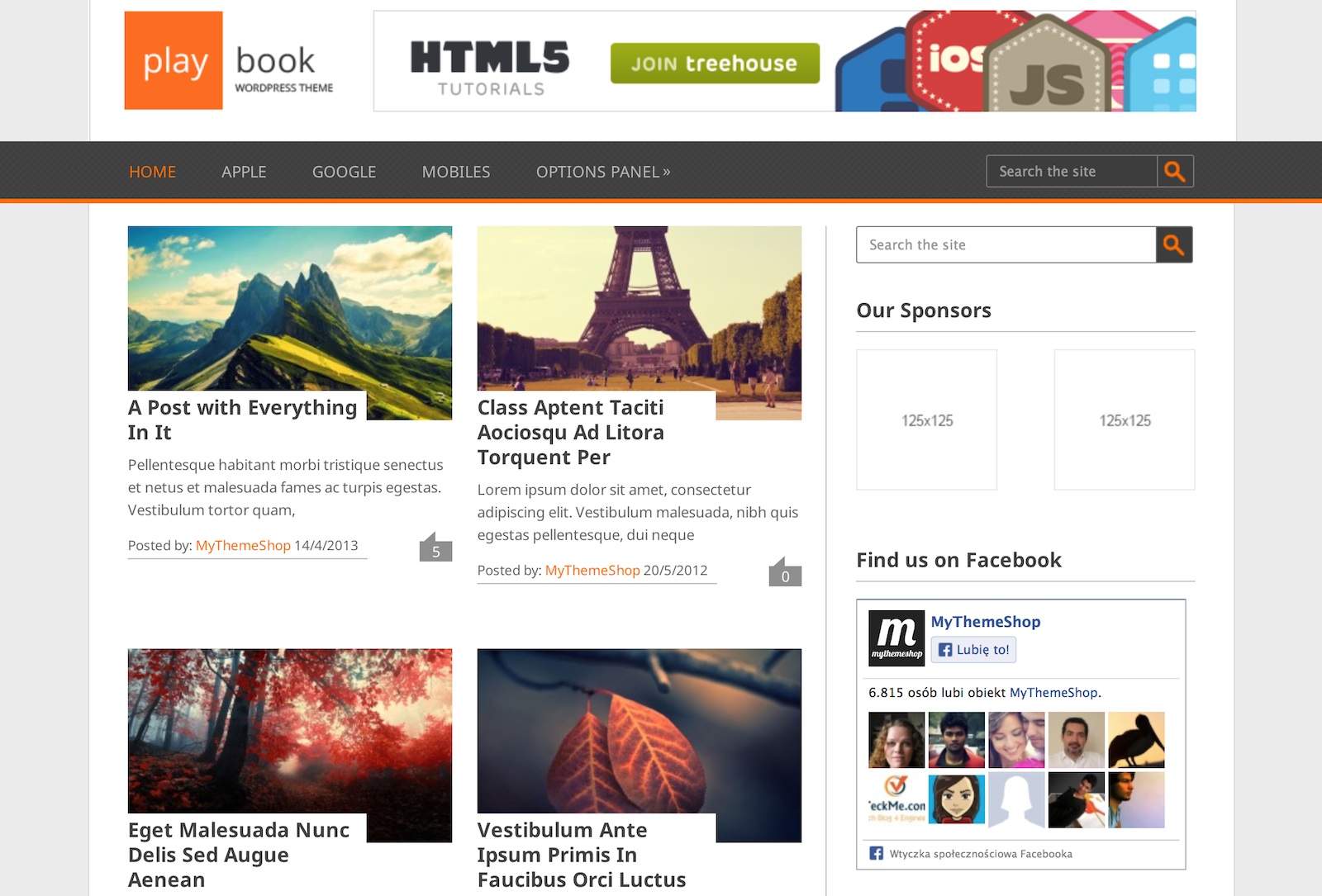 Całkiem sensowny szablon, wykonany w stylistyce przypominającej nieco serwis Pinterest (wpisy wyświetlane w formie prostokątnych „kafelków”).