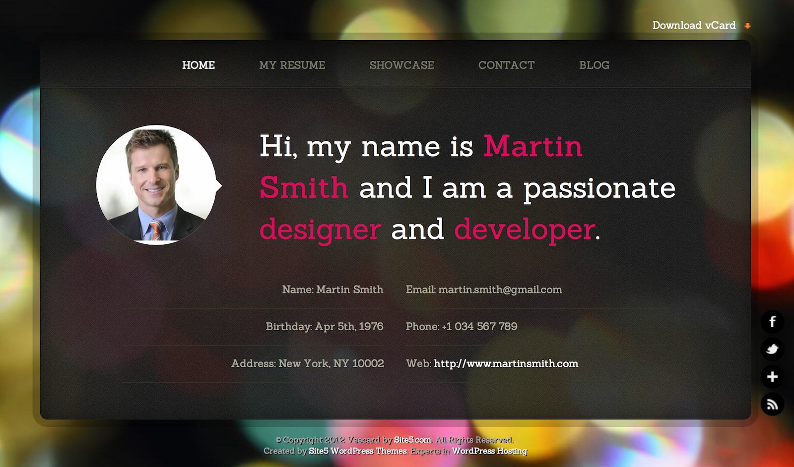 Responsywny szablon, którego strona główna ma formę wizytówki. Posiada dodatkowo możliwość zamieszczenia prostego portfolio graficznego.