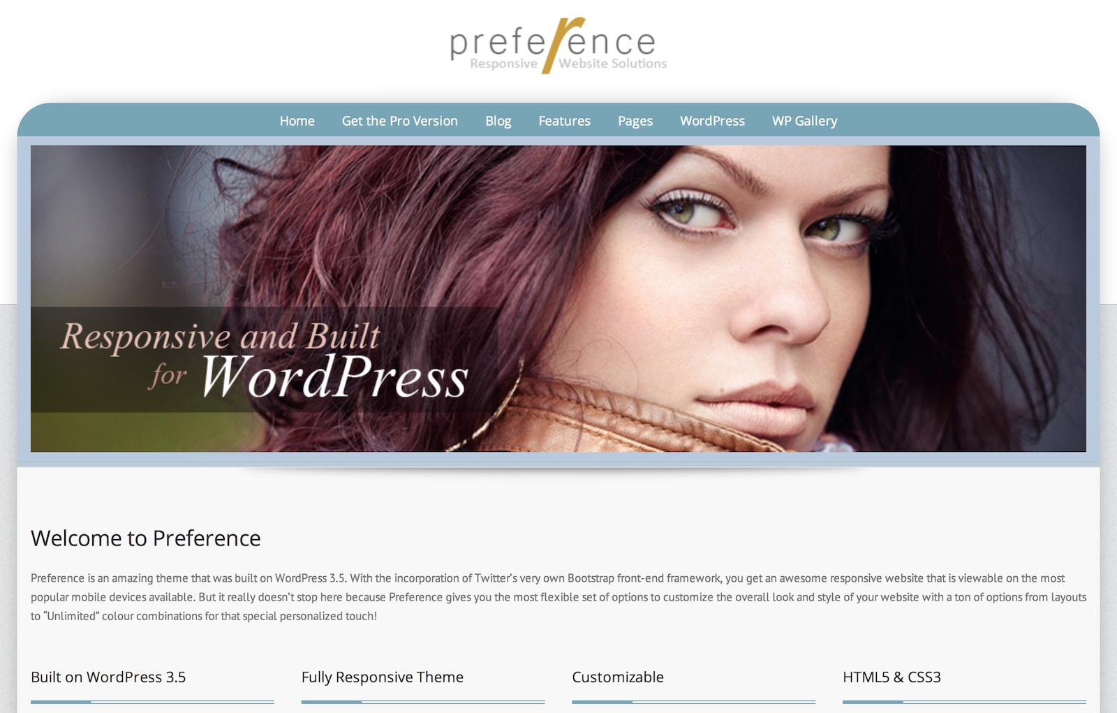 Darmowa wersja płatnego szablonu Preference Pro. Motyw może się podobać, a przy tym posiada sporo dodatkowych funkcji, takich jak osiem paneli bocznych, wsparcie dla wbudowany w WordPressa system personalizacji oraz możliwość dostosowania układu i kolorystyki.