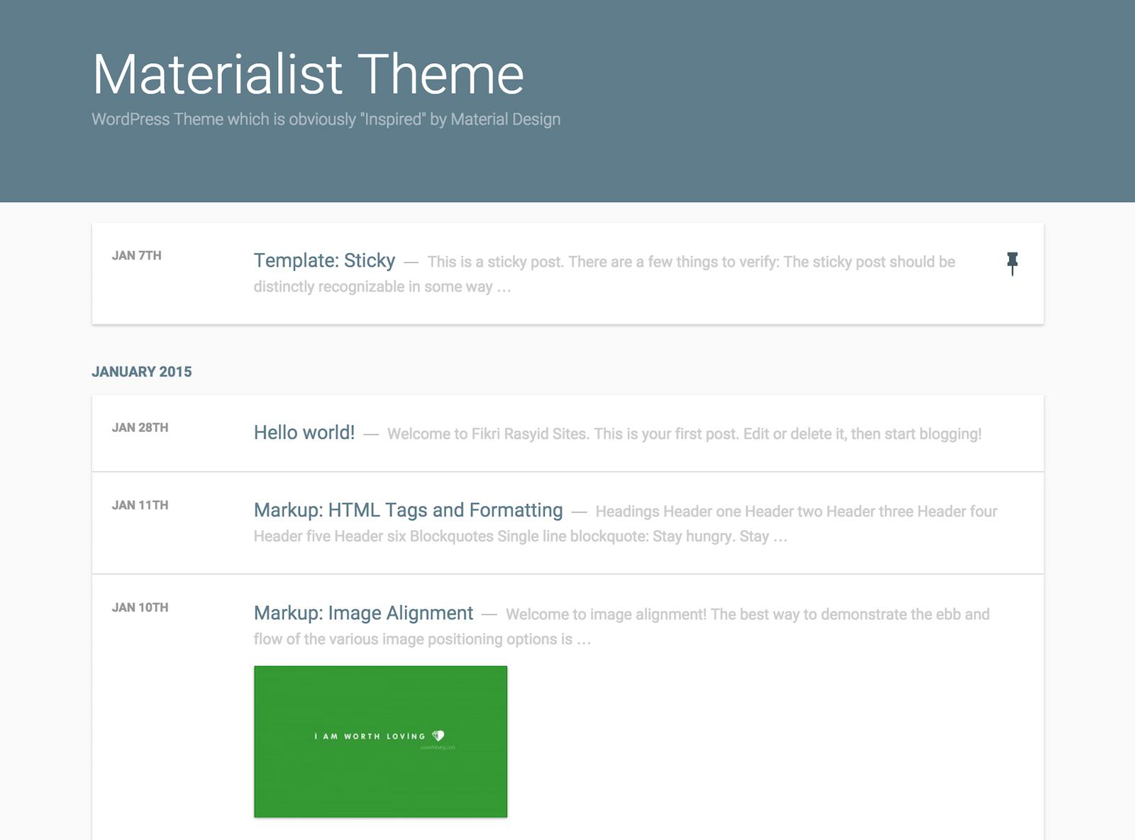 Minimalistyczny motyw blogowy, zaprojektowany w oparciu o Material Design. Strona główna zawiera tylko prostą listę tytułów wpisów.
