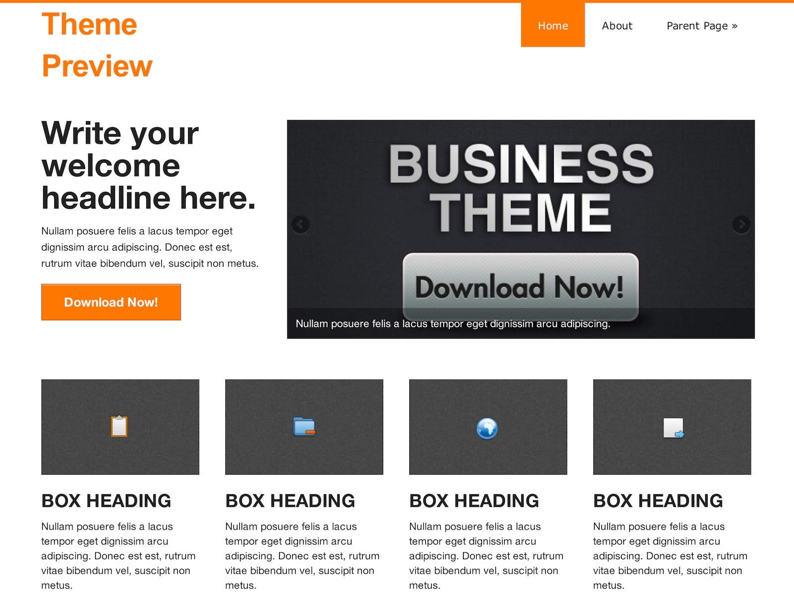 Szablon ze specyficznym (opcjonalnym) nagłówkiem, dzięki któremu motyw można wykorzystać do stworzenia prostej strony firmowej lub witryny produktu.