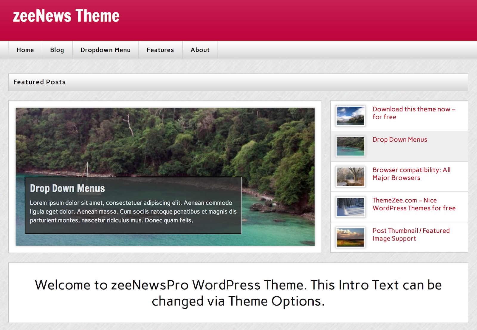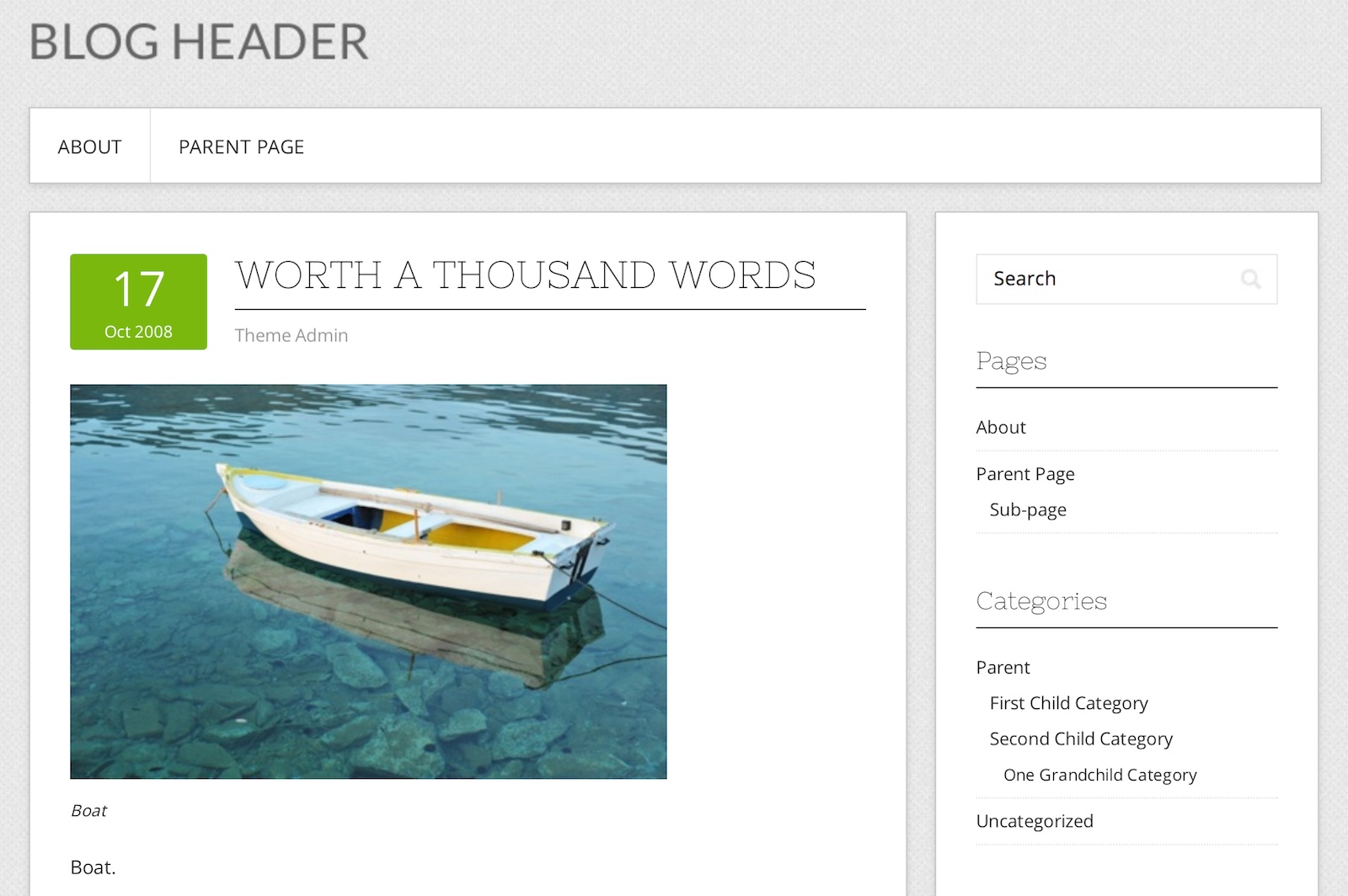 Prosty, jednokolumnowy motyw dla bloga, wyróżniający się rozwijanymi menu i panelem bocznym (sidebar), umieszczonym na dole strony.