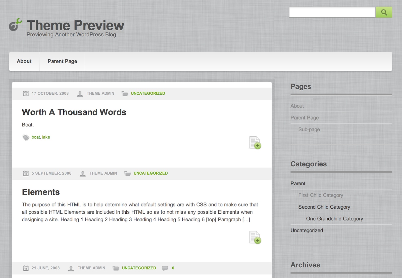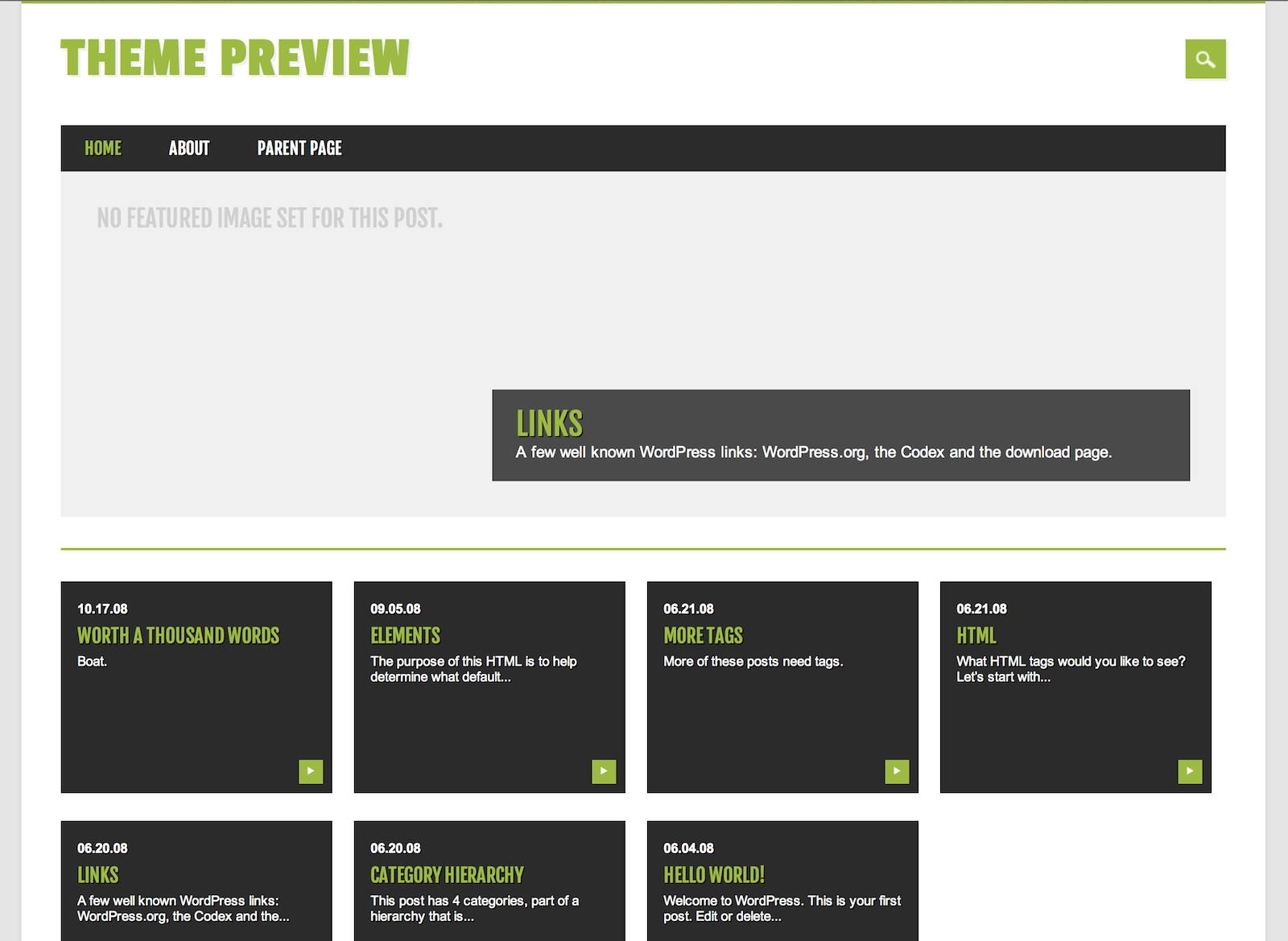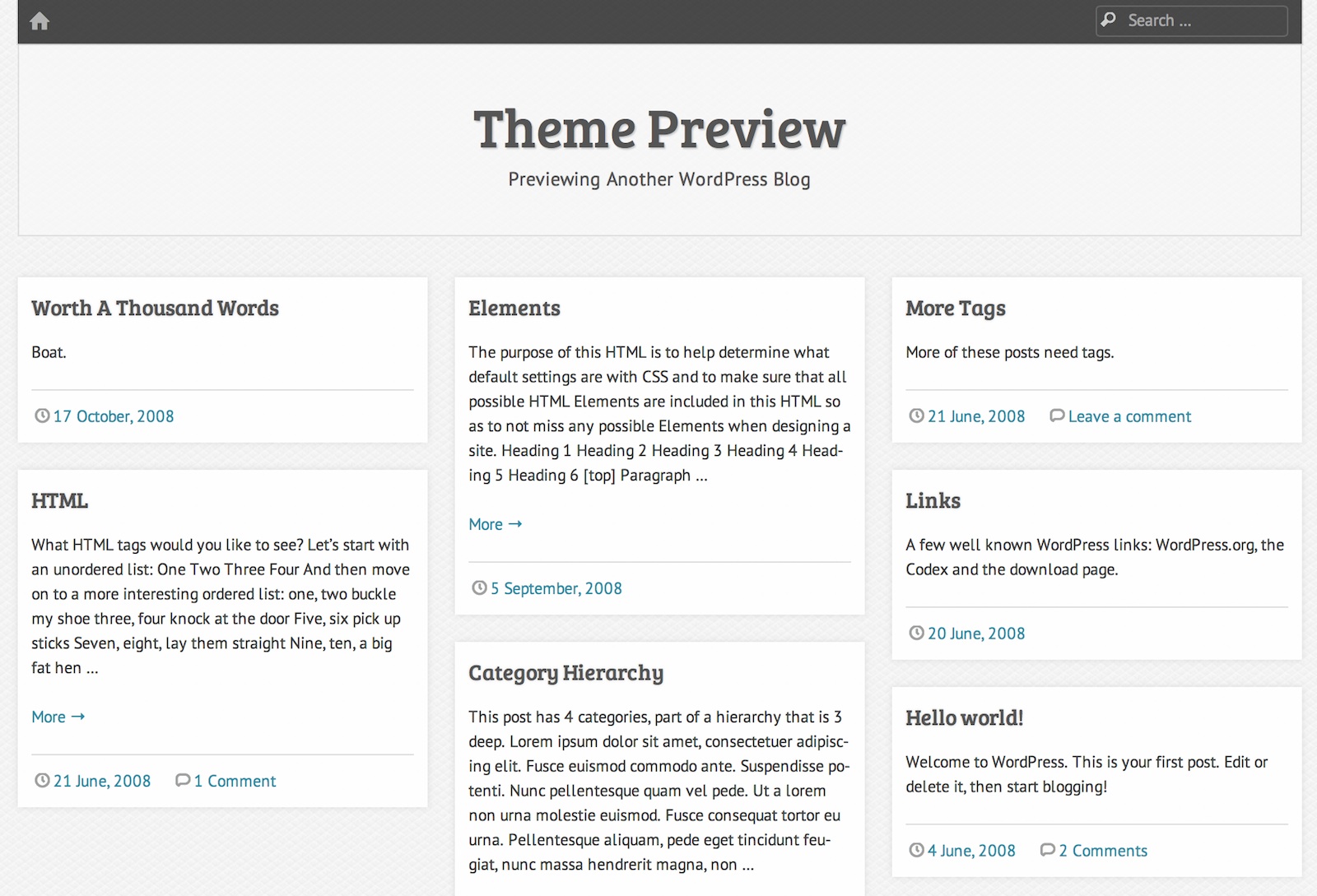 Ładny szablon wyświetlający wpisy w formie boksów z ikonami wpisów (niestety, nie widać tego na screenie ani na wersji demonstracyjnej szablonu).