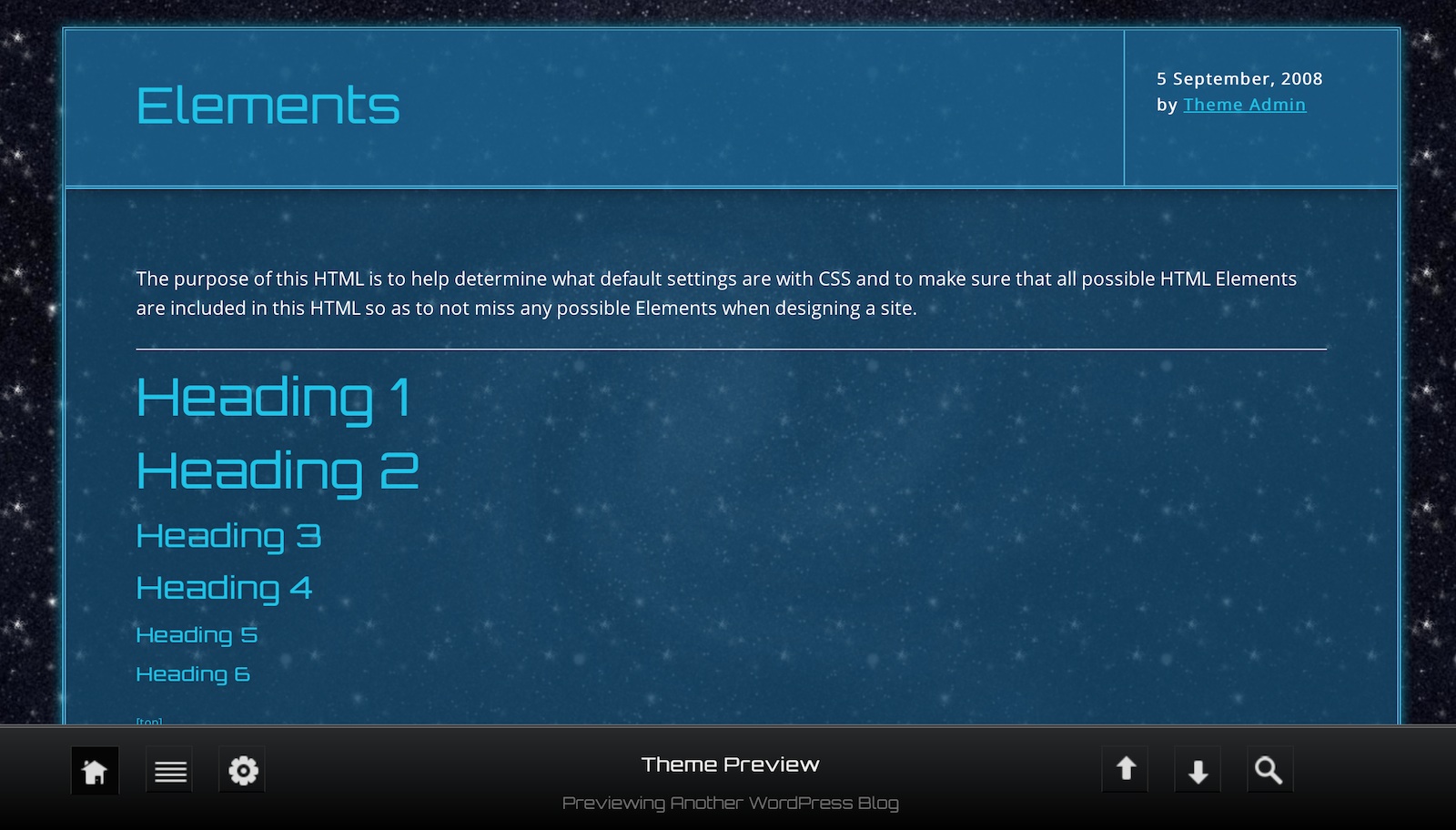 Motyw wykonany w kosmicznym (dosłownie) stylu. Wyróżnia go właściwie wszystko: oprawa graficzna rodem z panelu sterowania pojazdu kosmicznego, przyklejone do dolnej krawędzi okna przeglądarki menu czy sposób ładowania kolejnych wpisów.